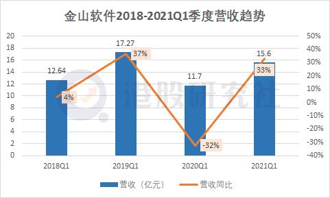 根据财报,截至2021年3月31日的三个月内,金山软件实现收入15.6亿元,同比增长了33%,相比去年同期的负增长,已经实现了转正,基本恢复了2019年同期的37%增速水平。