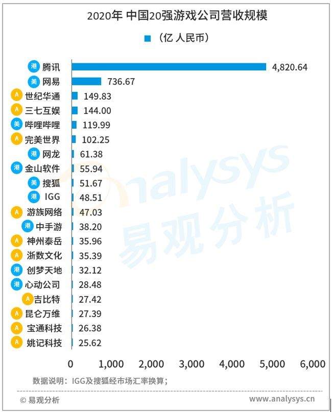 这首先跟大的市场环境相关。目前,在国内游戏市场,腾讯和网易是两座大山,头部效应明显。根据易观千帆数据,2020年中国前20前公司,腾讯和网易分别以4820亿元和736亿元位列一二位,金山软件则以56亿元的数据位列第8。排名虽然进入了前十,但是在体量上,依然相差悬殊。