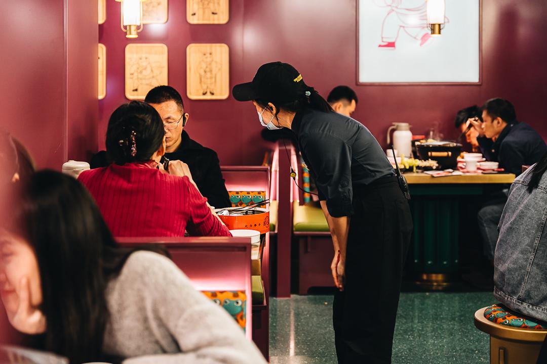 不仅如此,蛙小侠还将IP植入到门店的运营当中。蛙小侠的门店员工跟食客问好的方式,是边抱拳边说“大侠/女侠/少侠好”,他们穿着的衣服也是极具武侠风,整个就餐体验非常具有江湖风范。在员工之间,领班级的叫师傅,服务员就分豆腐和功夫,豆腐就是新近的员工。