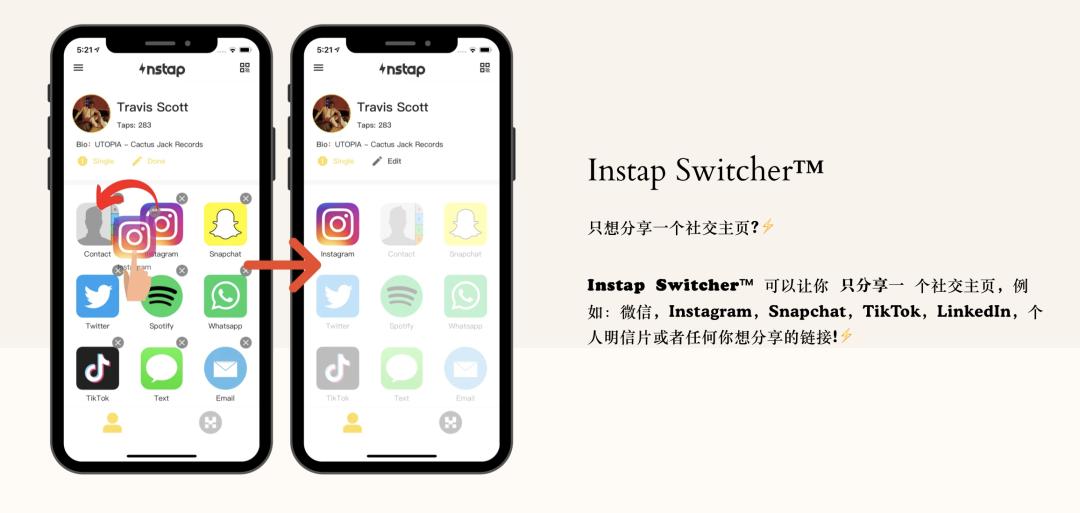 以Instap为例,用户花79元购买之后,需要下载一个产品App,用搭载NFC功能的手机激活芯片贴,然后再在App上跟着简单的教程进行设置,在个人“社交主页”上添加社交媒体账户的链接。其他有NFC功能的手机只要轻碰芯片,完成扫描,就能得到网页链接的弹窗,再通过“社交主页”跳转至其他社交网络。整个过程,不需要下载另外的软件。
