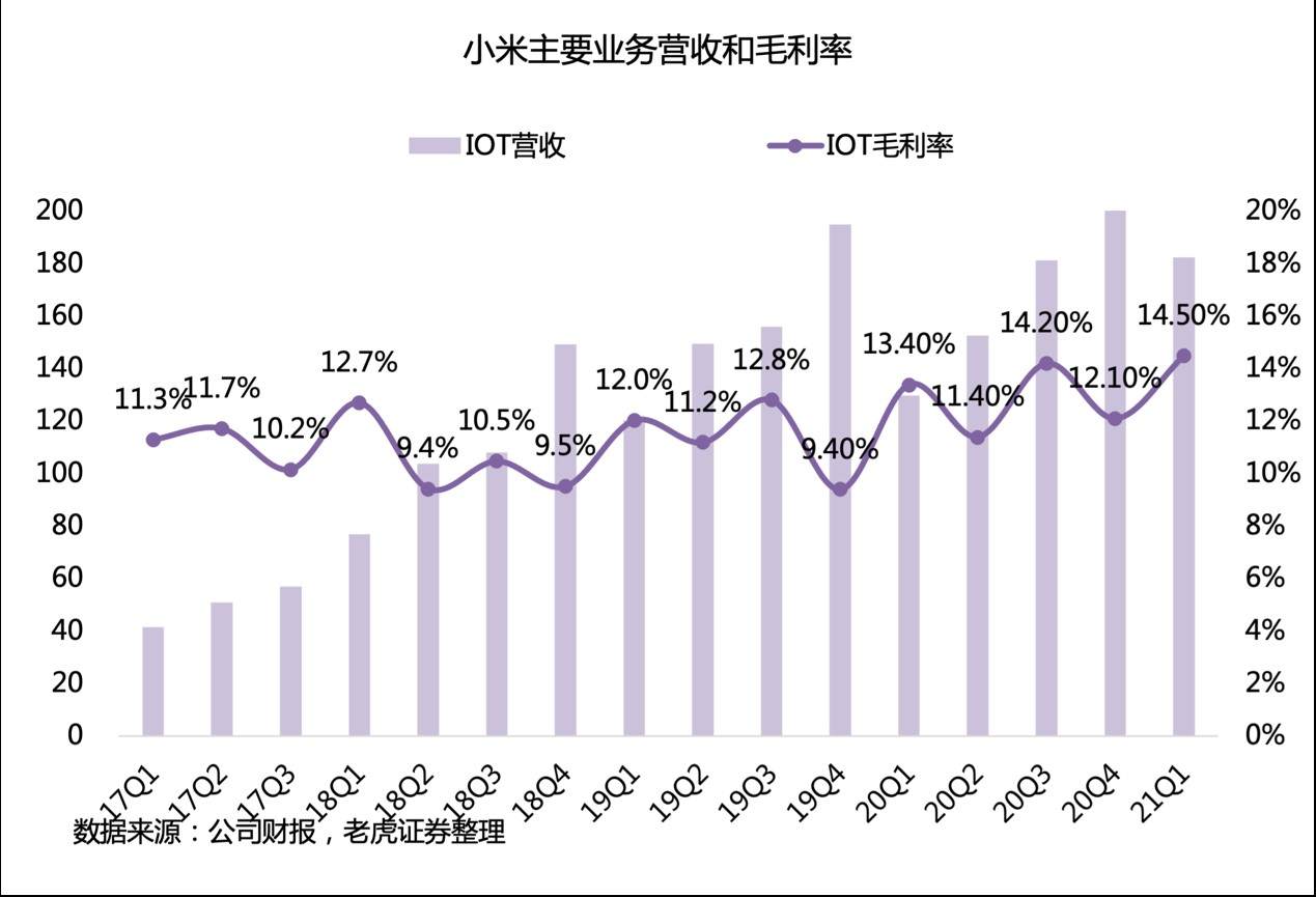 其中智能手机分部毛利率由2020年第一季度的8.1%升至2021年第一季度的12.9%,主要是由于供应短缺导致促销活动减少以及产品组合升级。其实从小米智能手机业务的毛利率表现我们不难看出,小米近一年的毛利率都在增加,主要是因为5G时代来临,引发人们更换高端机型,从而促进了小米的毛利率改善。