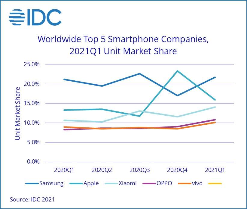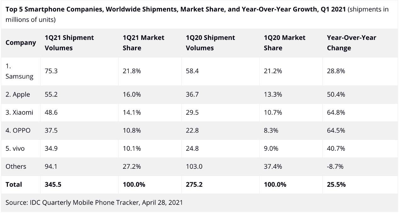 数据增长的背后有经济复苏的影响,去年同期由于疫情的影响,包括小米和苹果在内的手机厂商营收数据均出现了下滑,与之相比,今年的数据大涨,也就不足为怪。其实,根据IDC全球手机季度跟踪报告的数据显示,2021年第一季度,智能手机市场的复苏势头加速,出货量同比增长25.5%。智能手机厂商在本季度出货量总计达3.46亿台。各区域均展现出强劲的增长势头,而其中最高的增长来自中国和亚太区,分别贡献了30%和28%的同比增幅。