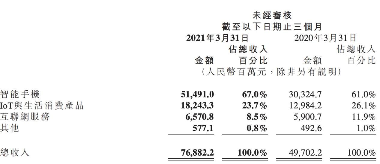 IoT与生活消费产品分部毛利率由2020年第一季度的13.4%升至2021年第一季度的14.5%,是由于部分毛利率较高的IoT产品的收入占比增高所致。
