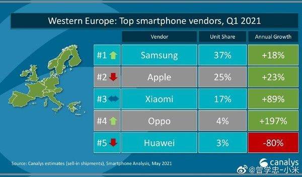 从全球出货数据来看,三星和苹果位居第一、二名。紧随其后的是小米,凭借14.1%的份额稳居第三,与苹果的差距也在加速缩小。至于市场份额大增的原因除了上文提到的疫情复苏的原因之外,还得益于小米在欧洲地区业务发力。5月6日,小米集团副总裁曾学忠发微博称,第一季度欧洲智能手机市场中,小米的市场份额超过苹果,首次达到第二,在东欧地区连续2个季度市场份额第一。