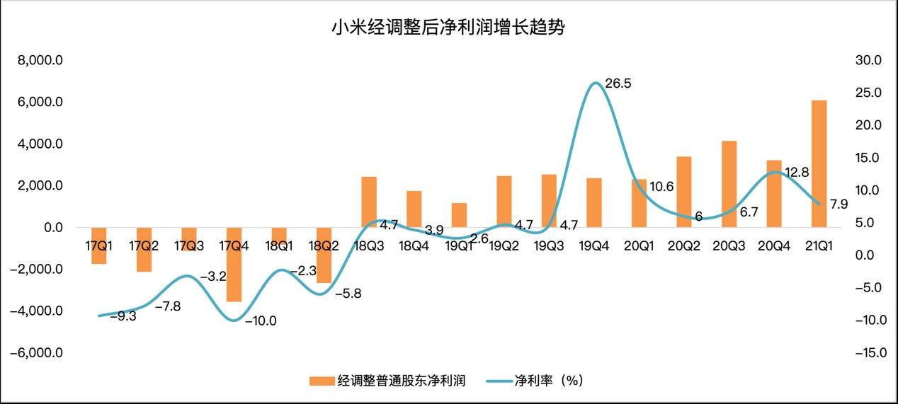 小米一季度财报从数据层面来看,真是好到超乎想象。小米2021年第一季度营收768.8亿元,同比增长高达54.7%。经调整净利润60.69亿元,同比增长163%。虽然我们对小米做了乐观预期,但是没想到小米这次的财报居然这么亮眼。