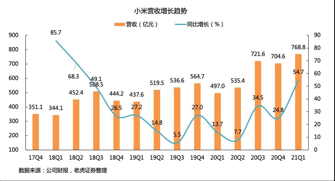 1.小米2021年第一季度营收768.8亿元,去年同期497亿元,同比增长54.7%,高于彭博分析师一致预期746.77亿元。