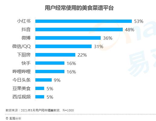 易观5月26日发布的《中国美食内容消费用户洞察2021》报告指出,48%的用户会因为受到抖音、小红书等美食内容激发而下厨。