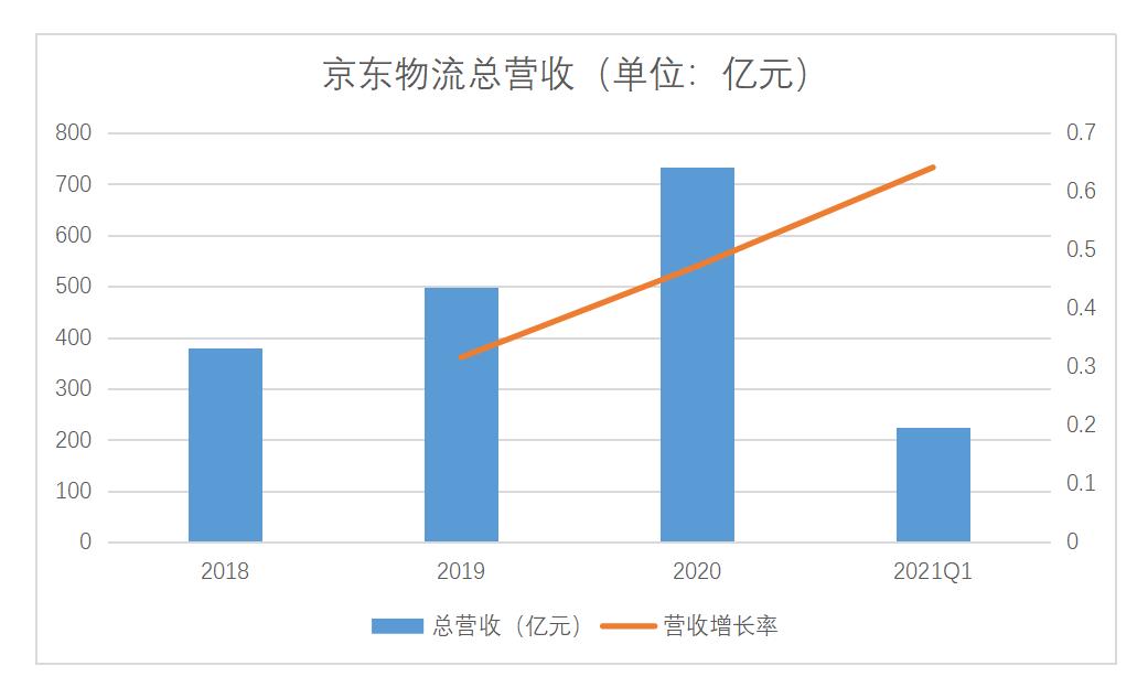 京东物流招股书显示,2018至2020年,京东物流营收连年增长,2020年相比2018年几乎翻倍,营收增长率也一路走高。2021年一季度的最新数据显示,京东物流收入达到224亿,同比增长64.1%,继续保持高速增长,这有力地证明了京东物流商业模式具备可持续发展价值,在市面上的竞争力不容小觑。