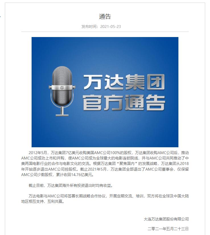 或许很多人不知道万达和一代影视公司的海外扩张故事,但他们现在看到了故事的结局——5月23日,万达集团发布官方公告,在“聚焦国内”的战略下,截止2021年5月,集团已经全部退出美国AMC公司董事会,仅保留少数股权。