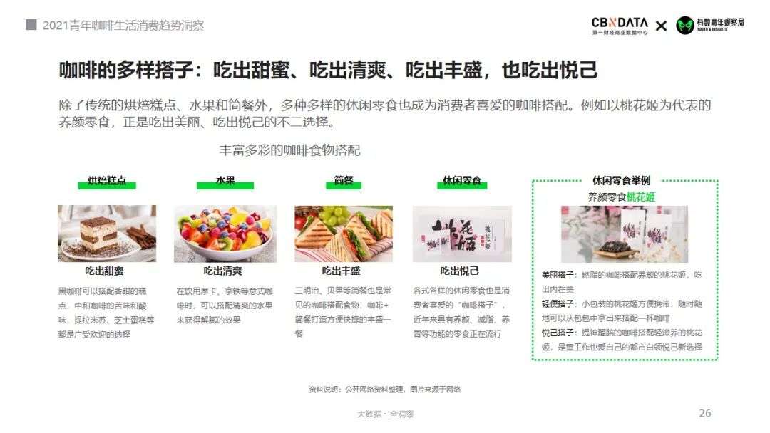 近年来,具有养颜、养胃等功能的休闲零食走红,也成为咖啡的新伴侣。以养颜零食桃花姬为例,便于携带的独立小包装让消费者随时随地开启下午茶模式成为可能,“燃脂+养颜”的健康组合是都市白领们吃出美丽的新选择。