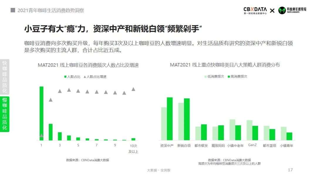 从原料来看,越来越多的“咖星人”开始在线上购买咖啡豆,豆子的客单价也逐年增加。根据CBNData《报告》,资深中产和新锐白领是咖啡豆消费大户,每年购买3次以上的人数明显增加。