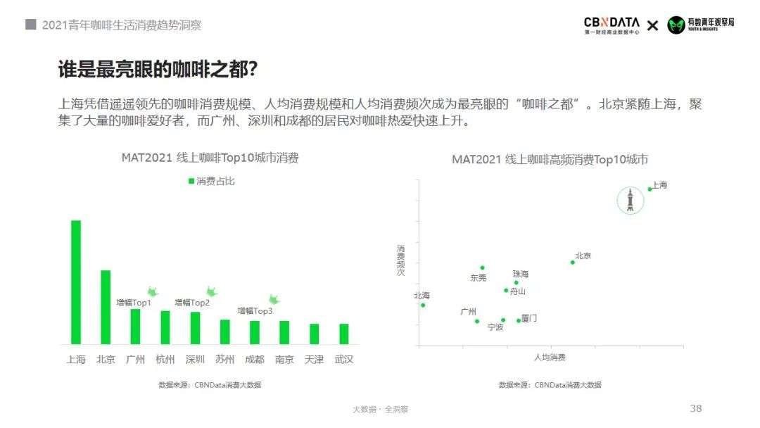1、上海的咖啡消费在全国一骑绝尘,是当之无愧的“咖啡之都”;广州和深圳是新晋“咖啡之城”