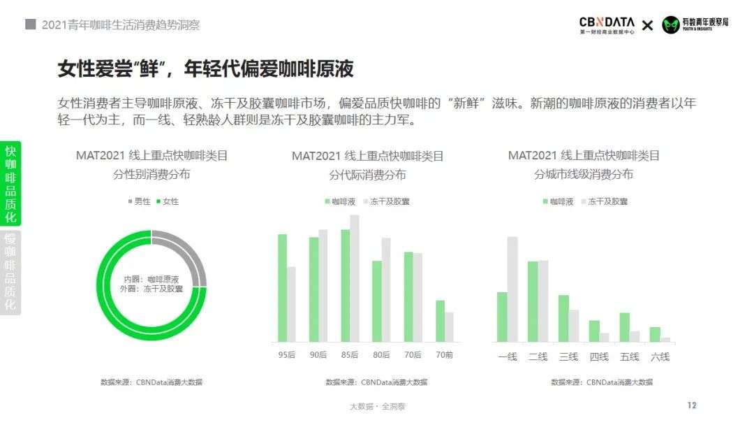 从消费人群画像来看,在主流的咖啡液和增长较快的冻干及胶囊咖啡中,超七成消费由女性贡献。其中咖啡液的消费群体更年轻化,冻干及胶囊咖啡的拥趸多为一二线城市的新锐白领和资深中产。