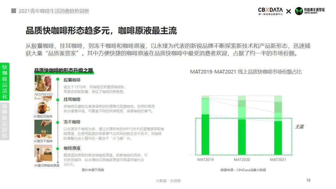 胶囊咖啡、挂耳咖啡、冻干咖啡、咖啡原液…… 品质快咖啡的形态层出不迭。其中方便快捷的咖啡液最受消费者欢迎。CBNData《报告》显示,咖啡液在线上品质快咖啡中的市场份额占比最高,同时,冻干咖啡和胶囊咖啡保持着较高增速,成为新晋潮流。