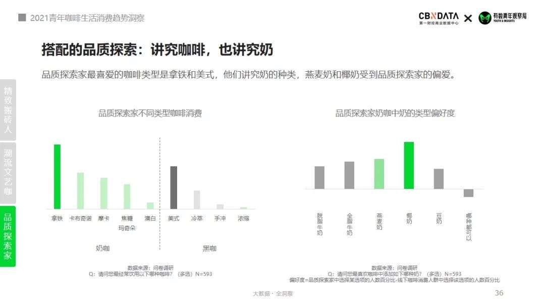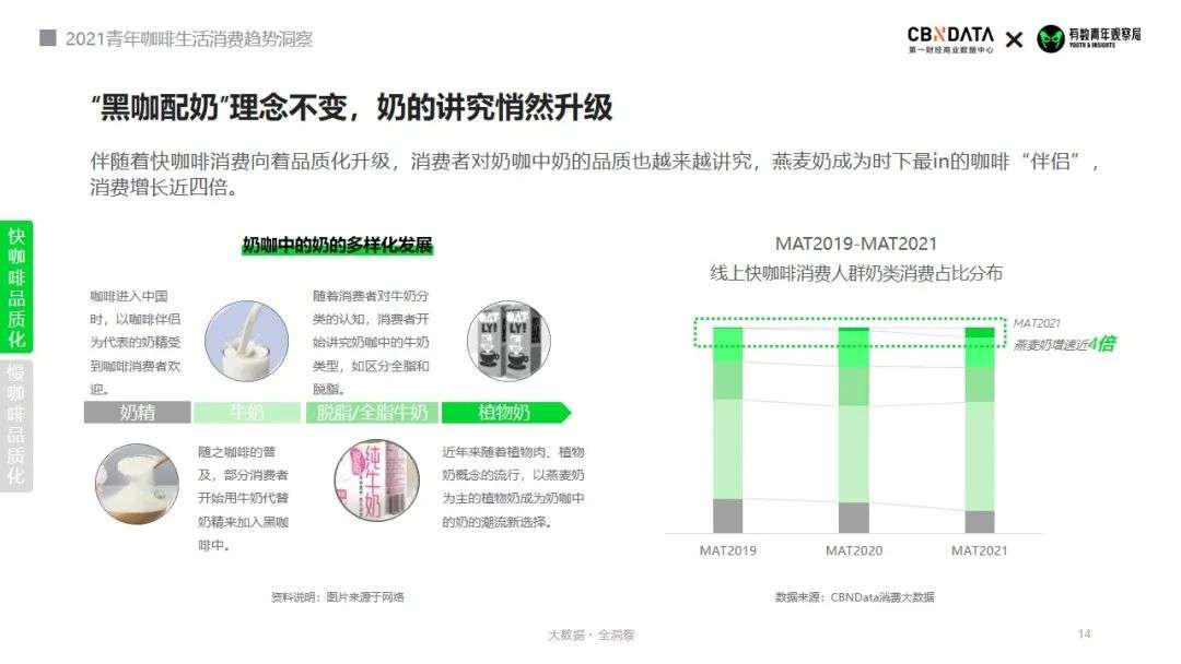 咖啡消费的品质化、精细化还体现在“咖啡伴侣”的升级上。CBNData《报告》显示,奶精消费占比逐年下降,消费者对“奶”的品质出现了多元化、健康化的诉求,如开始区分全脂和脱脂牛奶,或选择添加植物奶。高购买力的年轻消费者尤其青睐燕麦奶,快咖啡+燕麦奶的组合成为年轻人的时新选择。