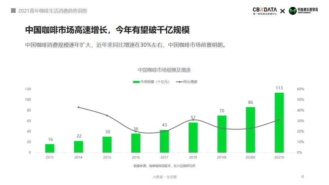 5月28日,第一财经商业数据中心(CBNData)联合有数青年观察局发布《2021青年咖啡生活消费趋势洞察》(以下简称CBNData《报告》,点击阅读原文查看完整版报告),总览高速发展的国内咖啡消费市场业态,着重从线上、线下两个视角,对当代青年的咖啡消费行为进行洞察和解析,描摹国内咖啡文化的新图景。