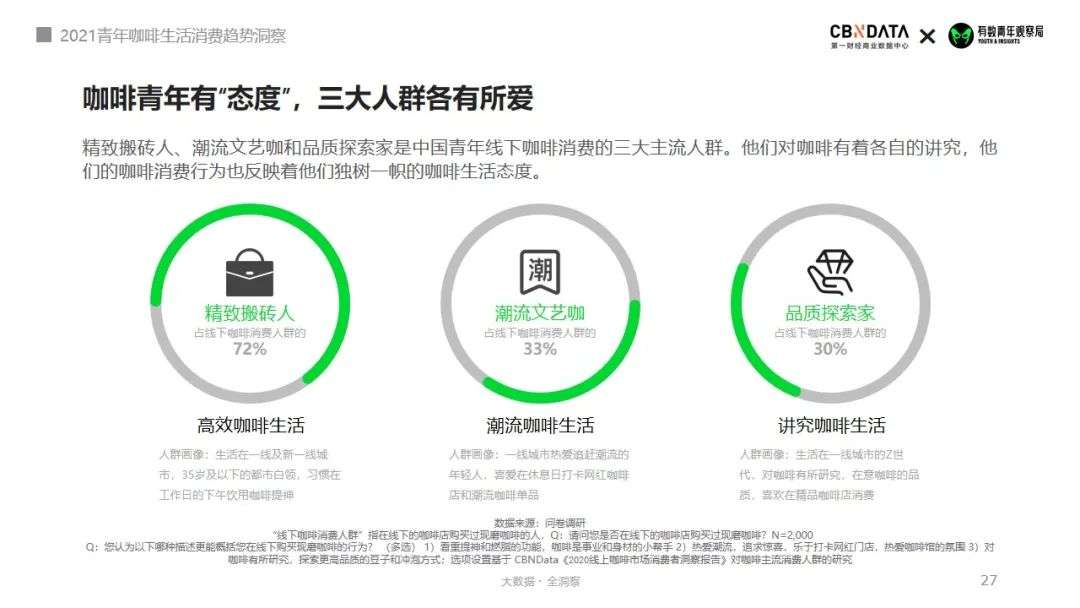 线下咖啡消费勾勒出了一种注重品质感的当代生活方式,但这群无处不在的咖啡“瘾者”究竟是何人?经过CBNData问卷调研,我们将这群青年概括为三大人群:精致搬砖人、潮流文艺咖、品质探索家。