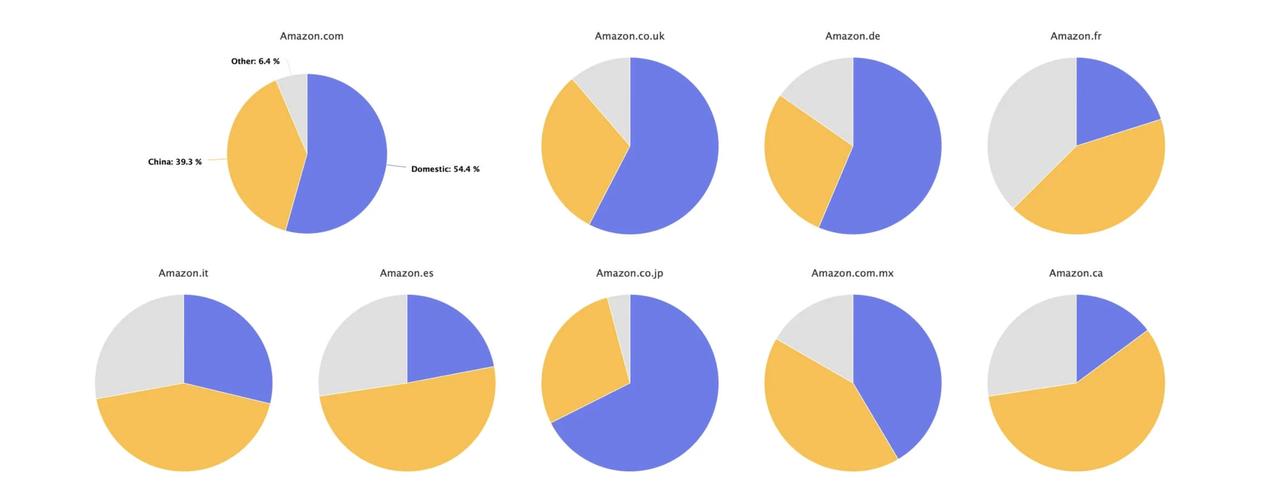 几个主要亚马逊站点上中国卖家、当地市场本土卖家和其他卖家的销售占比 | 数据来自 marketplacepulse