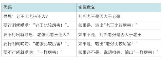 再比如想比两个数的大小,x叫老王,y叫老张。谁更大就输出“某某比较厉害”,相等就输出“一样厉害”。写成程序就是表格的左边: