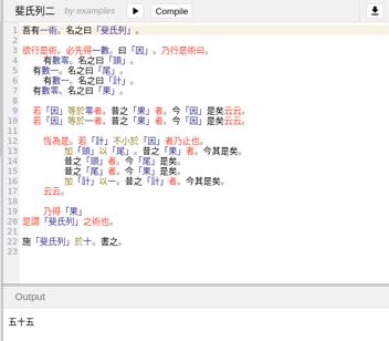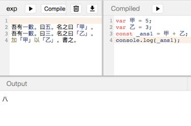 上面的编程方式虽然用的是中文,但整个语法基于英文编程,看起来还是令人费解。19年发布的文言文编程项目“文言 / wenyan‑lang”更进一步,让编程看起来真的像古文了。