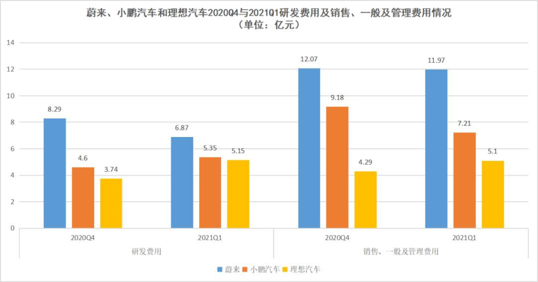 蔚来、小鹏汽车和理想汽车2020Q4与2021Q1研发费用及销售、一般及管理费用情况,数据来源于财报,连线出行制图