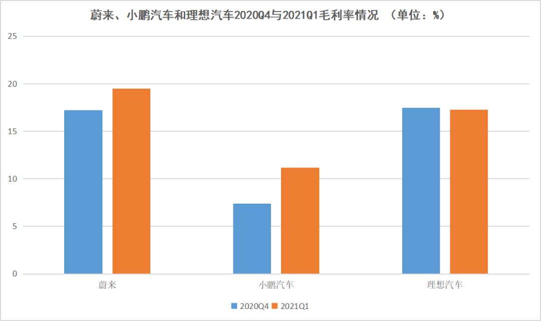 蔚来、小鹏汽车和理想汽车2020Q4与2021Q1毛利率情况,数据来源于财报,连线出行制图