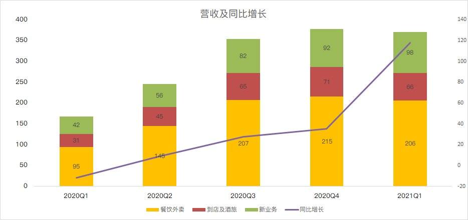 2021年第一季度,到店、酒店及旅游业务同样表现不俗,本季度收入同比增长112.7%至66亿元,营业利润同比增长304%至27亿元。