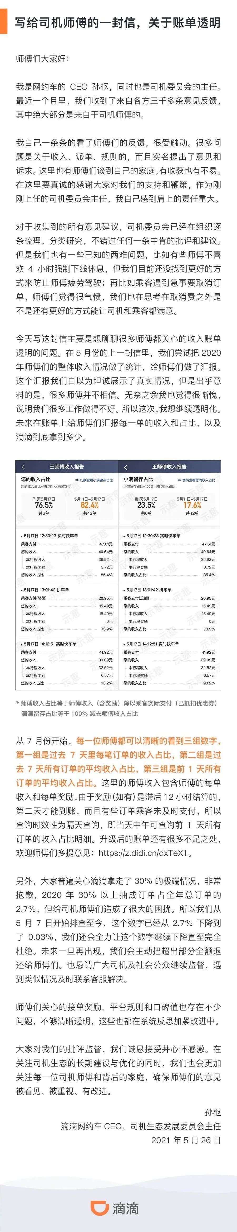 5月26日时滴滴又做了一次回应,要将行程账单透明化。滴滴网约车CEO、司机生态发展委员会主任孙枢表示,今年7月份,滴滴将在账单上给师傅们汇报每一单的收入和占比,以及滴滴到底拿到多少。