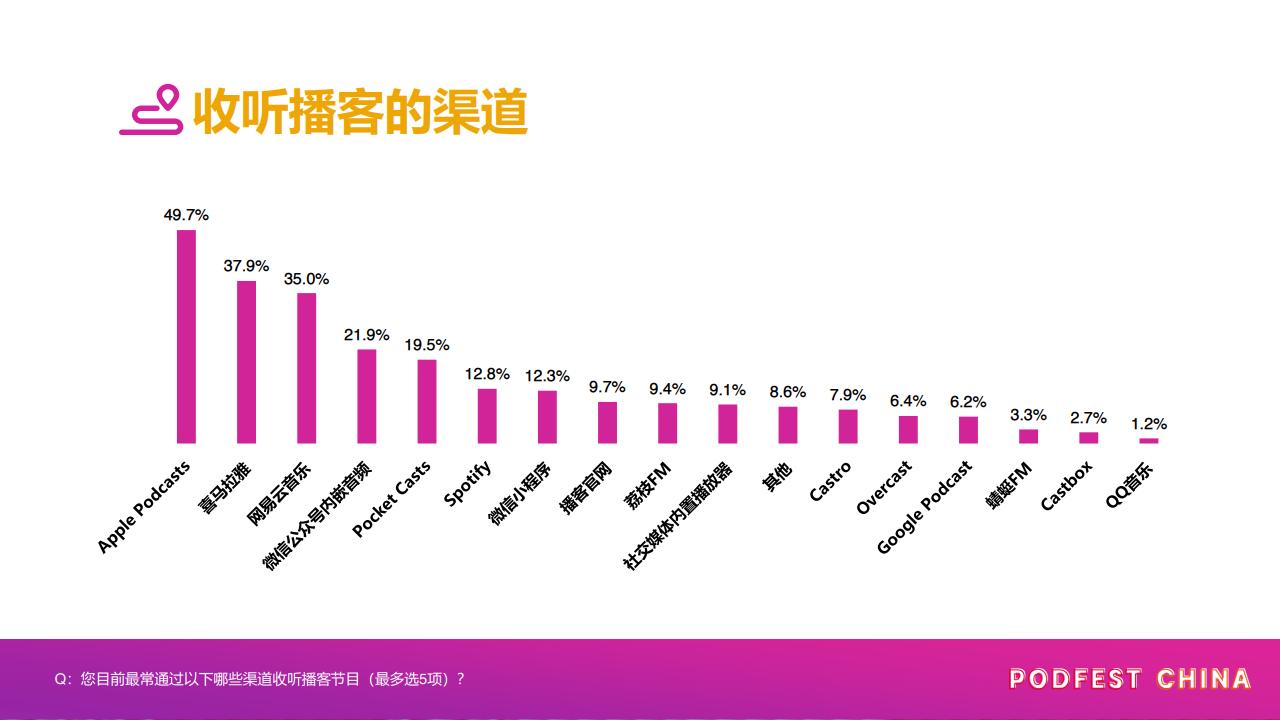 据《PodFest China 2020中文播客听众与消费调研》,中文播客听众最常使用的收听渠道前三名分别是Apple Podcasts (49.7%)、喜马拉雅(37.9%)、网易云音乐(35.0%)。这几个平台的用户青睐度,甚至远高于荔枝FM/蜻蜓FM等专业的音频平台。
