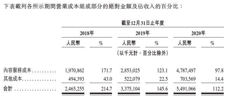 成本方面:2020年营业成本54.9亿。其中,内容服务成本47亿,占营收的百分比达到97.8%。