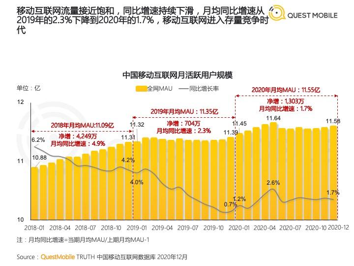 据《QuestMobile2020中国移动互联网年度大报告》,2020年全网月均MAU11.55亿,从年初的11.45 亿到12月的11.58 亿,净增1303万,月均增速只有1.7%。