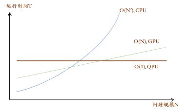 如图所示,解决问题的时间复杂度与算法有关。针对某一CPU、GPU、QPU都能解决的问题基于CPU开发的经典算法时间复杂度为O(N2),经过GPU并行计算优化后经典算法时间复杂度降低为O(N),基于QPU开发的量子算法利用量子叠加态原理时间复杂度保持在O(1)。在解决小规模问题时,QPU为获得运行结果的概率分布仍旧需要做多次观测,而GPU需要由CPU向GPU传输数据而消耗时间,因此CPU的效率最高。然而随着问题规模的增大,最终运行效率QPU>GPU>CPU。