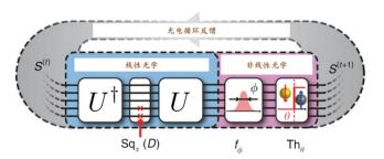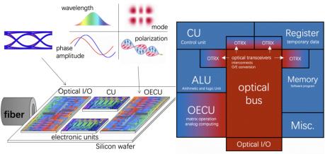 其架构需要包含如图所示的基本单元,其中光电计算单元(Optoelectronic Computing Unit, OECU)是计算处理性能提升的关键,用以实现高速的矩阵运算和模拟计算等。一些在光域上不便进行的计算操作,如信号延迟、数据缓存和逻辑运算等,仍需要引入算术逻辑单元(Arithmetic & Logic Unit, ALU),主控(Control Unit),寄存器(Register)、缓存(Memory)等,在电子处理单元中实现。而计算、控制和存储单元之间的互连通信和硬件系统I/O等,则通过光互连来实现。