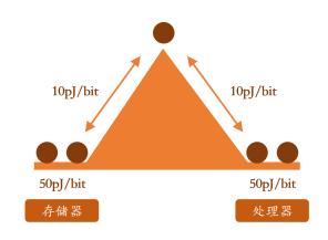 集成电路上的金属线属于电阻性器件,其本身具有的串联电阻使信号在传输过程中不断发生衰减。随着晶体管之间的铜互连线尺寸和间距的减小和微处理器频率的上升,信号发送器需要消耗更多的能量以保证信号能在一定距离内完整传输到接收端,这就是处理器和存储器之间存在着的另一堵“功耗墙”。数据从存储器搬运至处理器的耗能,远大于存储器内部数据搬运和处理器进行数据运算的耗能,两者相差达到100 倍以上。根据英特尔(Intel)的研究显示,CPU 工艺进入7nm 时代,数据传输和访存功耗占总功耗比重达到了63.7%。
