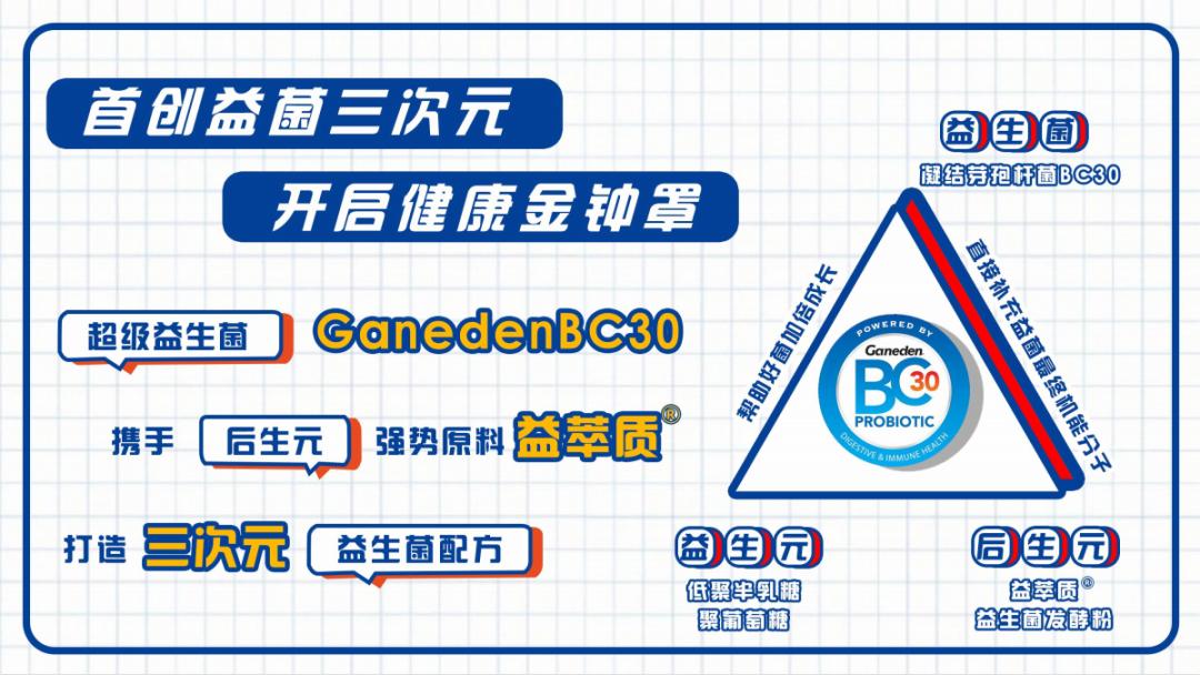 上个月,锦旗生物使用KERRY品牌出品的GanedenBC30益生菌,与益生元、以及锦旗生物旗下后生元独家原料益萃质相结合,研发出了一款“三次元益生菌”产品。