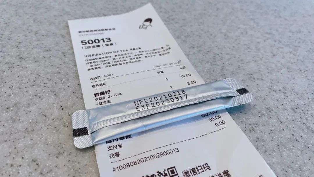 我专门去店里点了一杯岩爆柠体验,店员告诉我,益生菌是以条状包装的形式,一杯添加一条,也可以体验自己手动添加的乐趣。