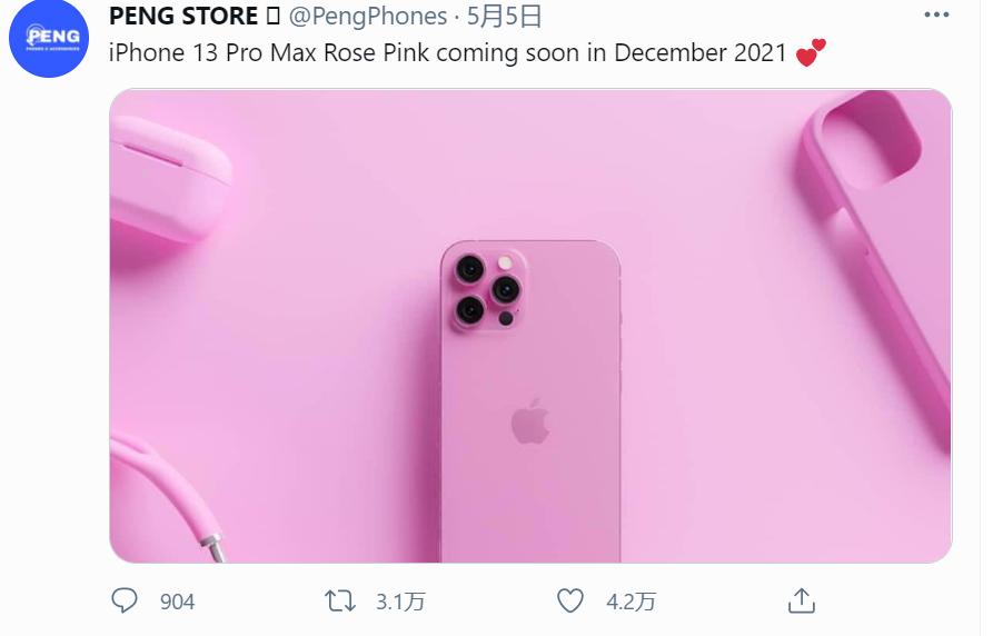 5月5日,一位名为Peng Phones的博主发布了一则没有任何消息来源的推文,号称苹果会发布“玫瑰粉”的iPhone 13 Pro Max,他甚至提到,2021年12月会发布“粉色”、“玫瑰粉”、“玫瑰金粉”。这则推特得到了40000个“喜欢”和30000次转发。