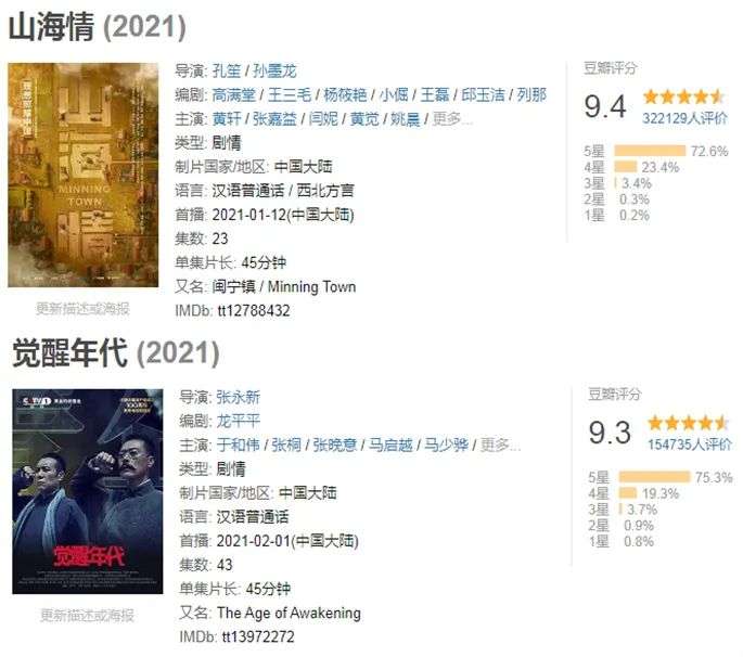 口碑更是达到了国剧罕见的高度,豆瓣评分达9.4、9.3,直接踩入国剧历史排行前五十。第27届上海电视节白玉兰奖公布的入围名单上,《觉醒年代》入围八项提名,把#觉醒年代yyds#又拉回微博热搜第五位。