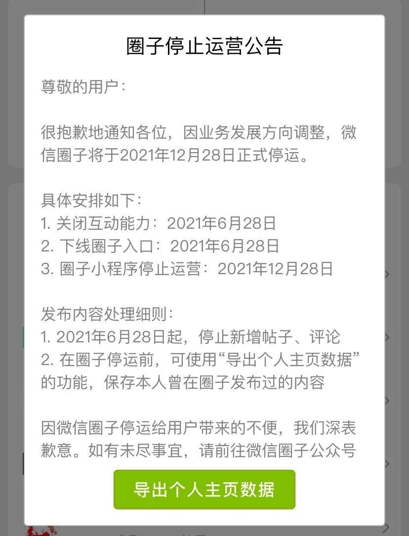 前两天看到一则消息,微信团队宣布将在今年的 12 月 28 号下线「微信圈子」并停止运营。