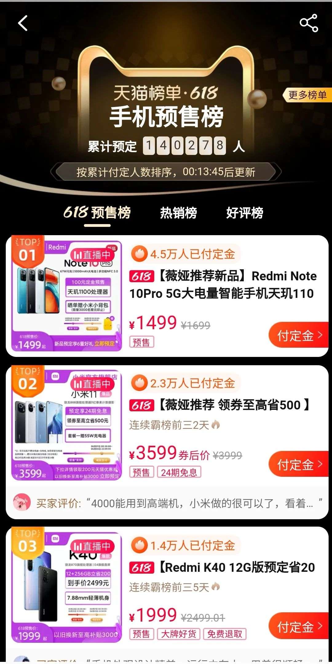 截至5月29日上午10点,Redmi Note 10Pro显示已有4.5万人支付定金,小米11则有2.3万人。