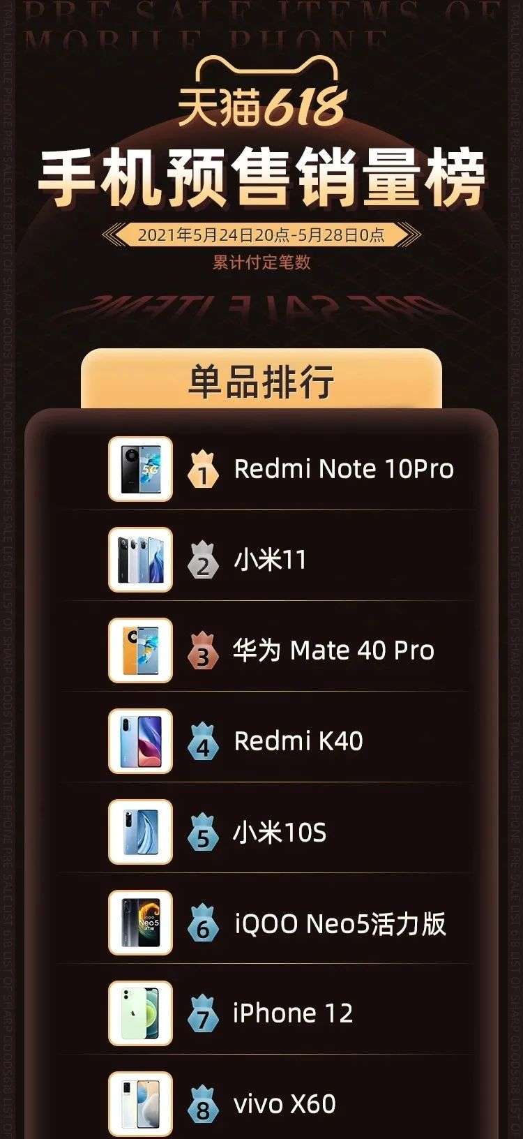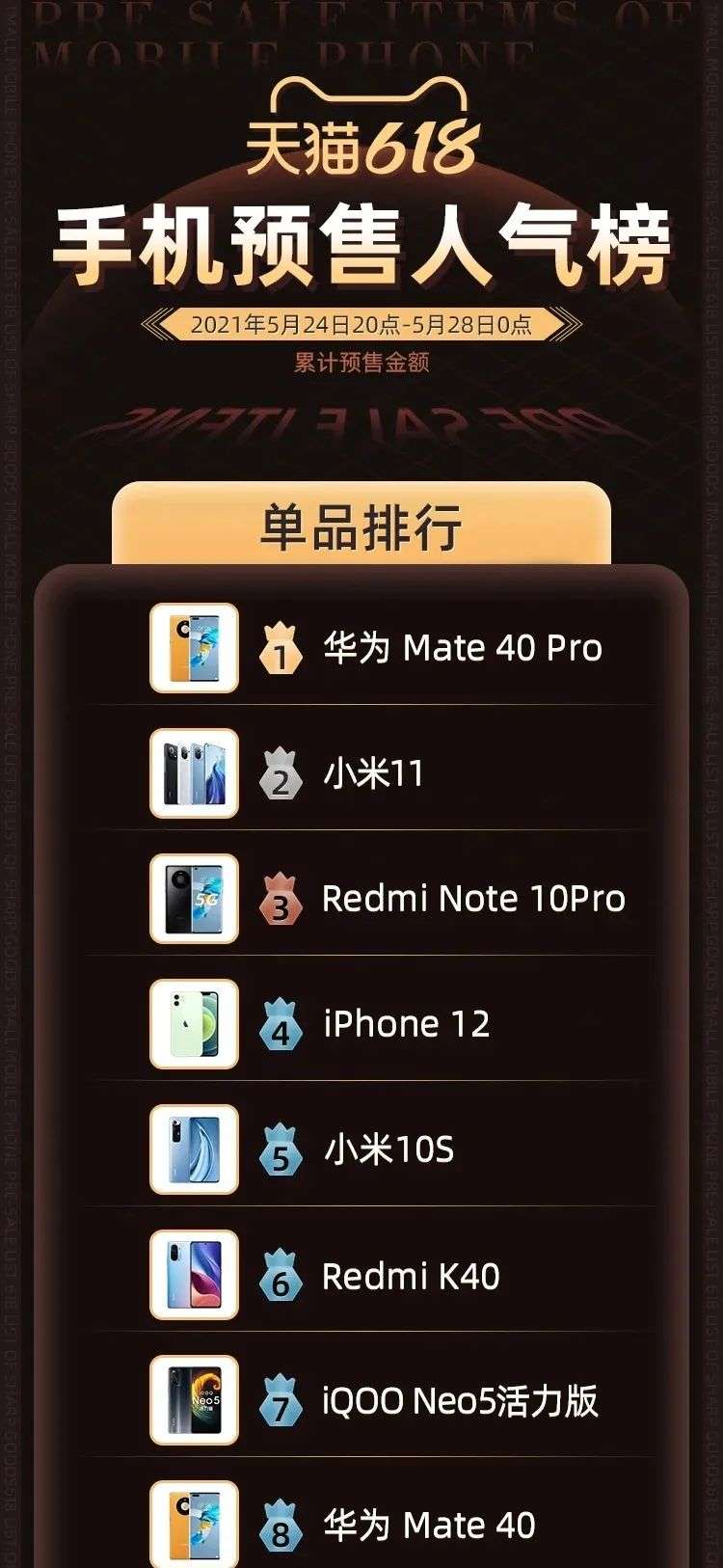 每年618大促,也因此成了用户换新的关键节点,消费力爆发也影响着手机厂商的供货节奏。天猫618手机预售单品榜单,每一小时都变更着排位——今天以前,华为Mate 40 Pro在预售人气榜上排名第一,力压小米11、Redmi Note 10Pro和iphone12。