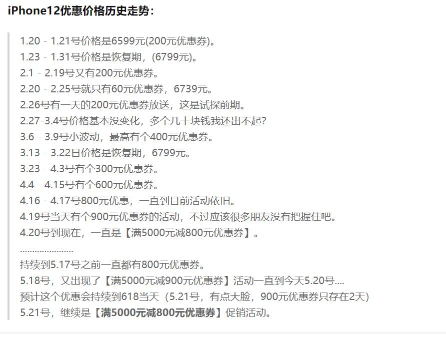 经验老道的消费者记起笔记,把手机涨跌价的套路摸得清清楚楚——“1月的时候买iPhone12肯定是最不划算的,官方售价就要6500多元,到2月有一波200元的优惠券放出来,这是降价的试探期,我依旧不会买。到4月份,600、800甚至900元的优惠券也有了,但价格还没有到最低。”