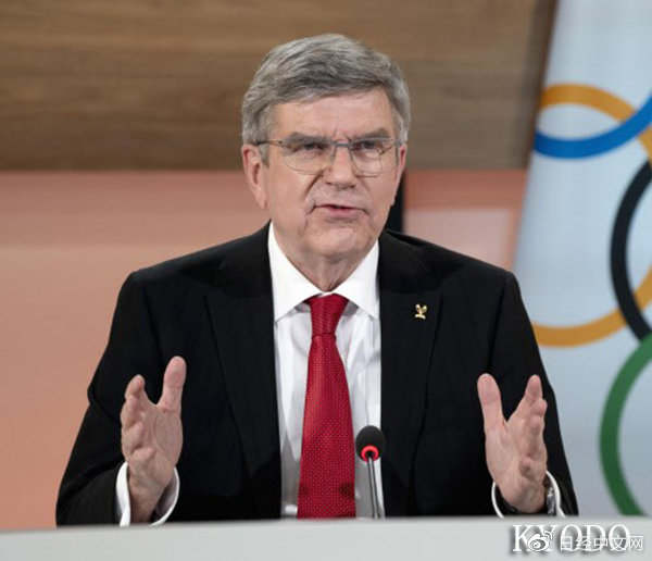 在国际奥委会大会上连任、举行记者会的主席托马斯·巴赫(3月,瑞士洛桑,国际奥委会提供,kyodo)