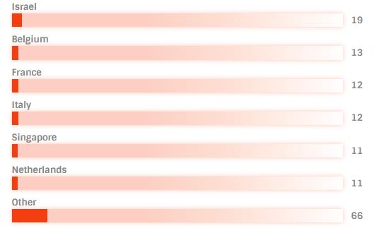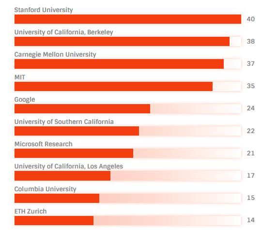 在22所领先的机构中,有16所大学位于美国,3所位于欧洲(École Polytechnique Fédérale de Lausanne,瑞士苏黎世联邦理工学院,比利时鲁汶大学和英国牛津大学),还有两所是美国私营公司(谷歌和微软)。