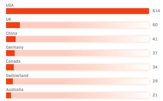 在该排名中,美国以614名上榜科学家数量主导着排名,占总数的61.4%,与2020年的排行类似;其他排名靠前的国家包括英国(60位,占6%)、中国(53位,占5.3%)、德国(37位,占3.7%)、加拿大(34位,占3.4%)和瑞士(29位,占2.9%)。