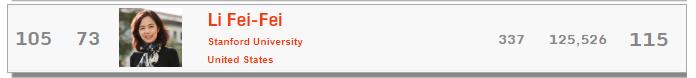 李飞飞的Google H-index 指数为115,引用次数125,526,DBLP论文337篇。