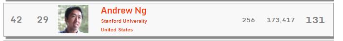 Andrew Ng的Google H-index指数为131,引用次数173,417,DBLP论文256篇。