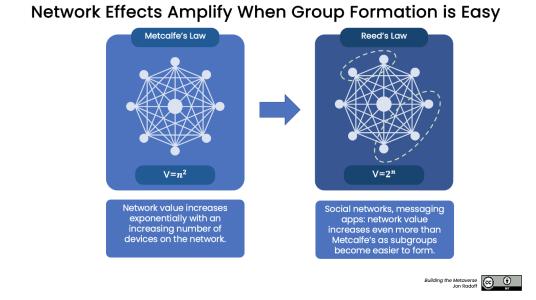 这是一个庞大的网络效应,根据里德定律,网络中节点越多,其价值就越高。区块链计算的出现可能会取代某方面的云计算。另外,虚拟资产的广泛应用,可能成为新兴一代游戏角色、皮肤和元宇宙体验中虚拟商品的基础,而这只是开放互联网的初期阶段。