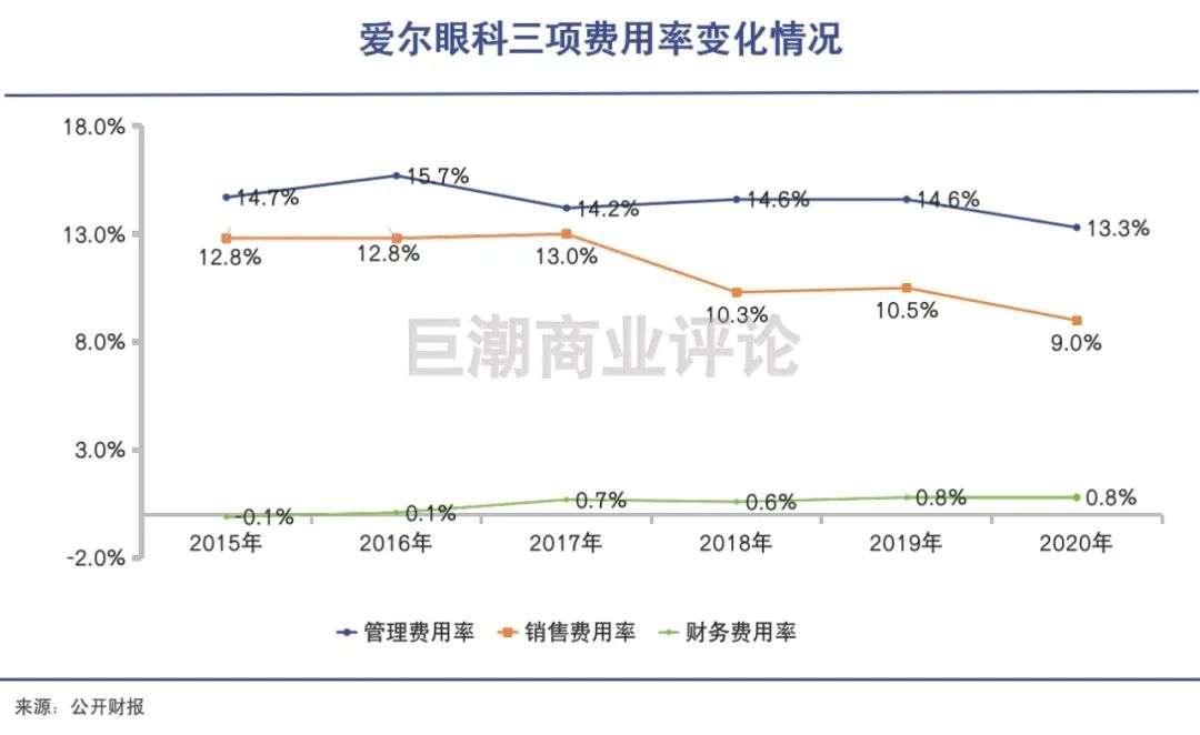 不仅如此,我们通过观察其三项费用的变化情况,可以看到爱尔眼科已经度过了在销售、宣传和品牌等方面进行高密度投入的时期,自2016年开始,董事长陈邦就不断削减各类投入,换来的结果是,公司的营业收入和利润继续高增长。