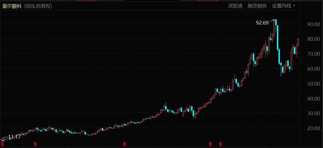 随后的事情投资者耳熟能详:高瓴资本张磊选择全额认购10亿元,全包,认购价格为27.6元每股。如今爱尔眼科的股价在80元以上。